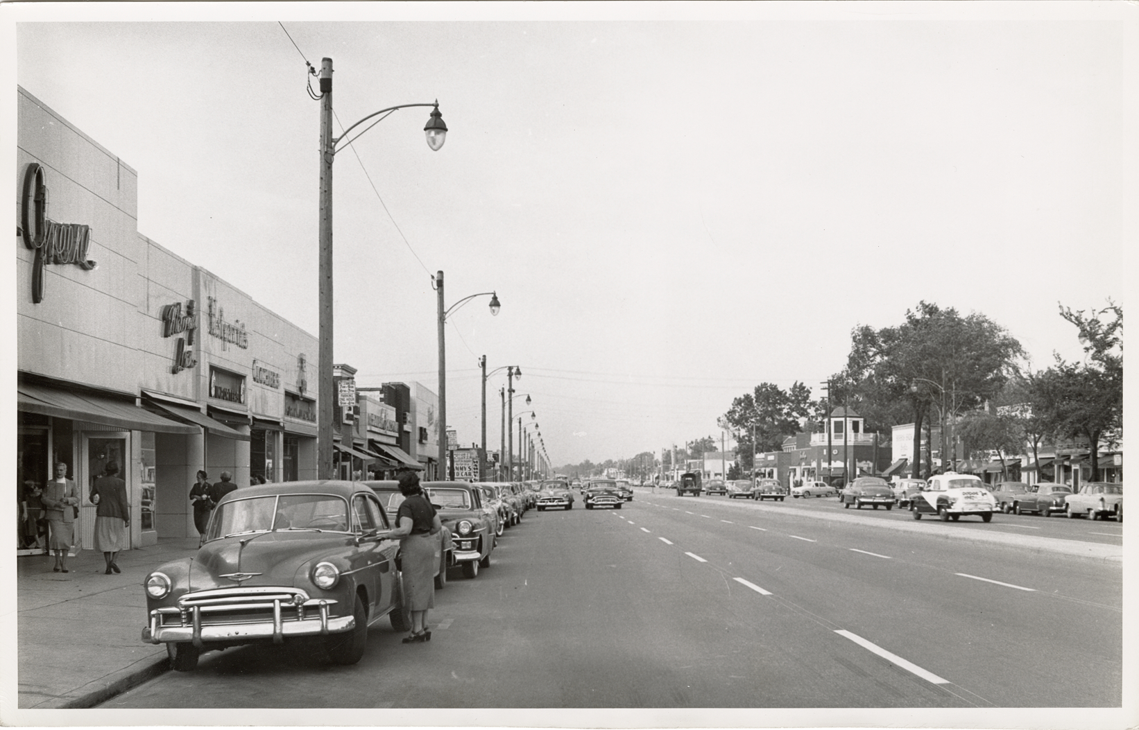 View of commercial buildings on Livernois Ave. Cars are parked in street. Stamped on back: "Harold Raymond." Handwritten on back: "West side of Livernois looking north from Seven Mile Road."