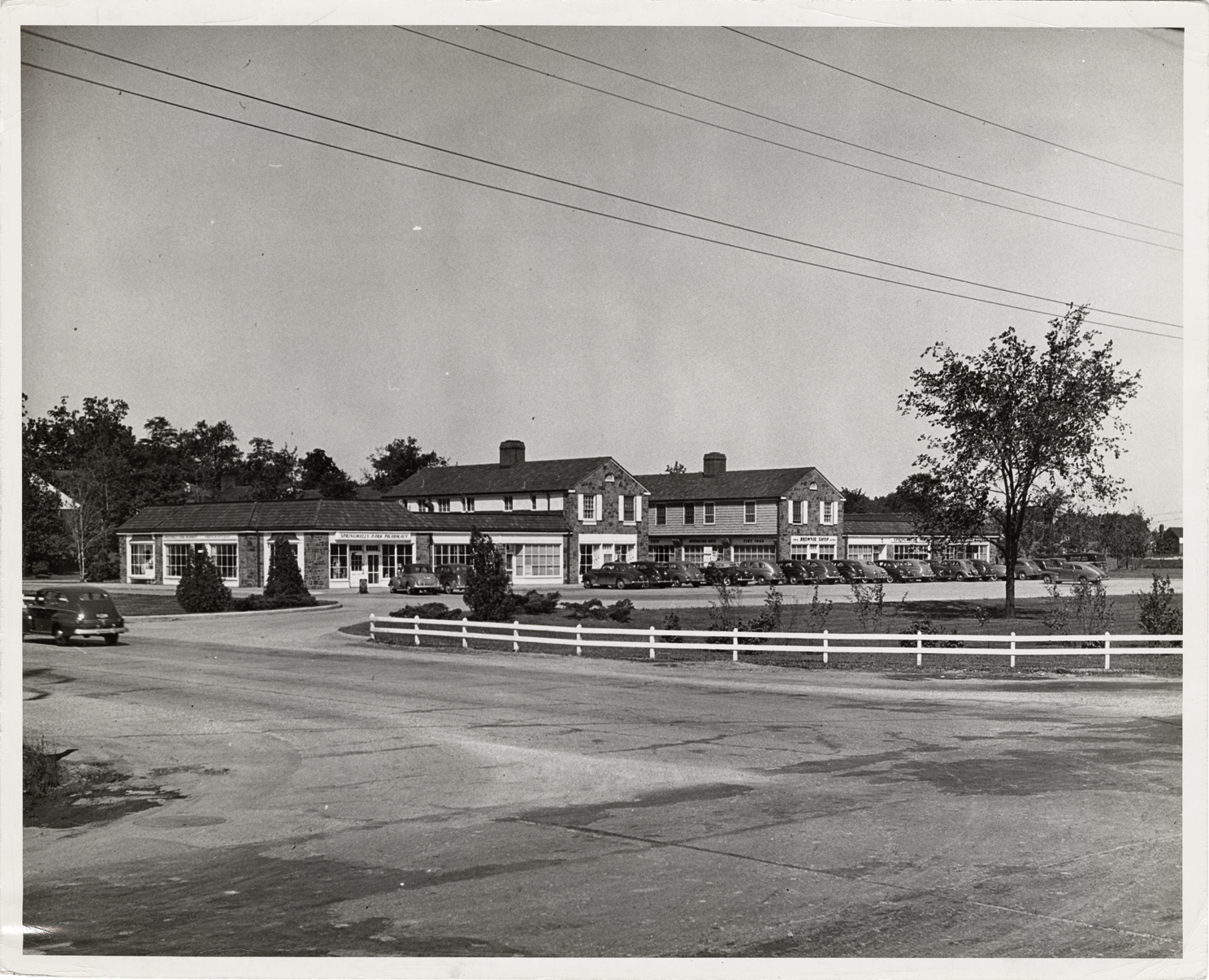 View of stores at the Ford Foundation Springwells Park neighborhood shopping center in Dearborn, Michigan. Stamped on back: "Photograph by Harold Raymond. No. Q2." Handwritten on back: "Ford Foundation. Picture is reversed."