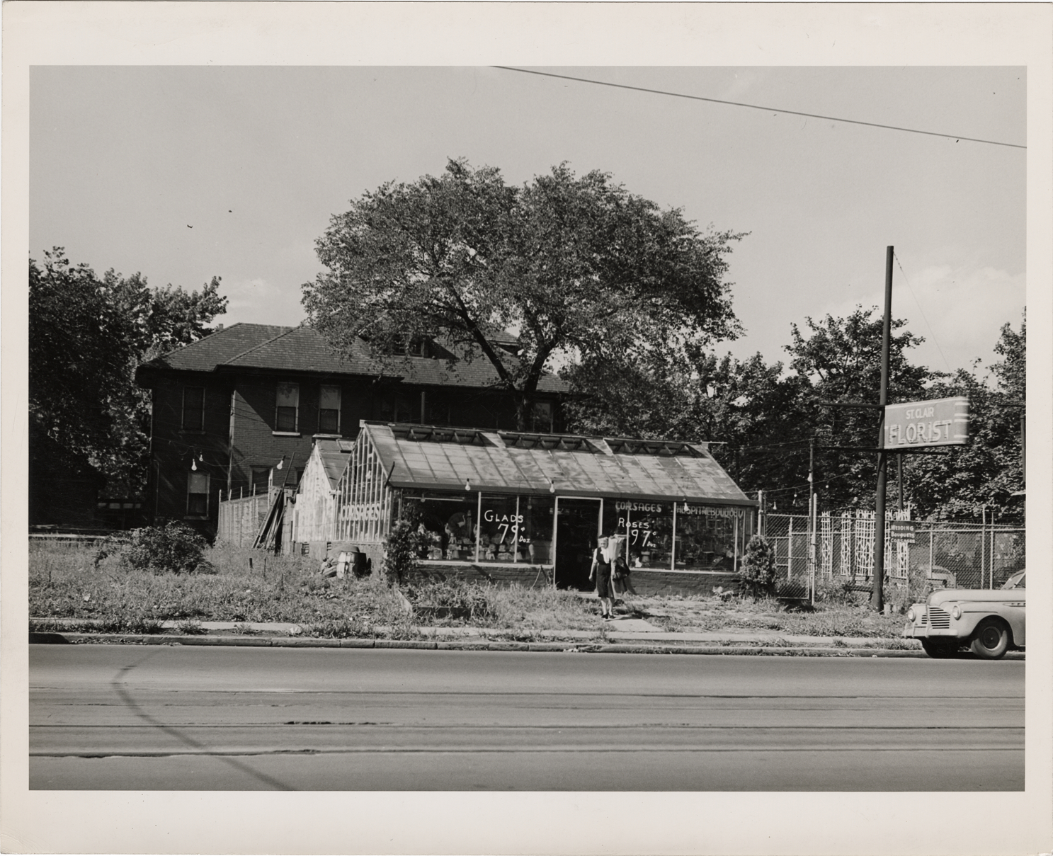 View of St. Clair Florist, located on Jefferson Avenue and St. Clair. Stamped on back: "Detroit City Plan Commission. Photograph by Harold Raymond. No. BJ24." Handwritten on back: "Land use. Florist shop. Jefferson & St. Clair."