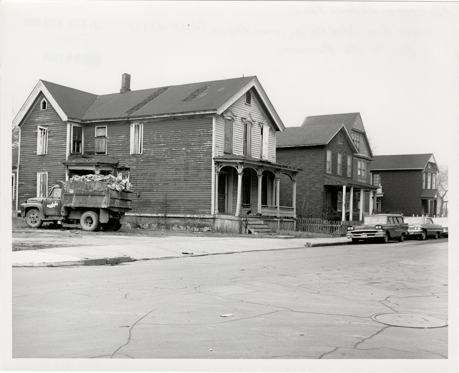View of a two-story, wooden-frame house and other houses located at 4313-4339 4th St. Truck carrying refuse parked adjacent to house; station wagon and automobiles parked in street. Stamped on back: "Taken Mar 28, 1966." Handwritten on back: "Calumet Rehab. Proj. West side 4th St. looking north (4313-4339). All to be removed."
