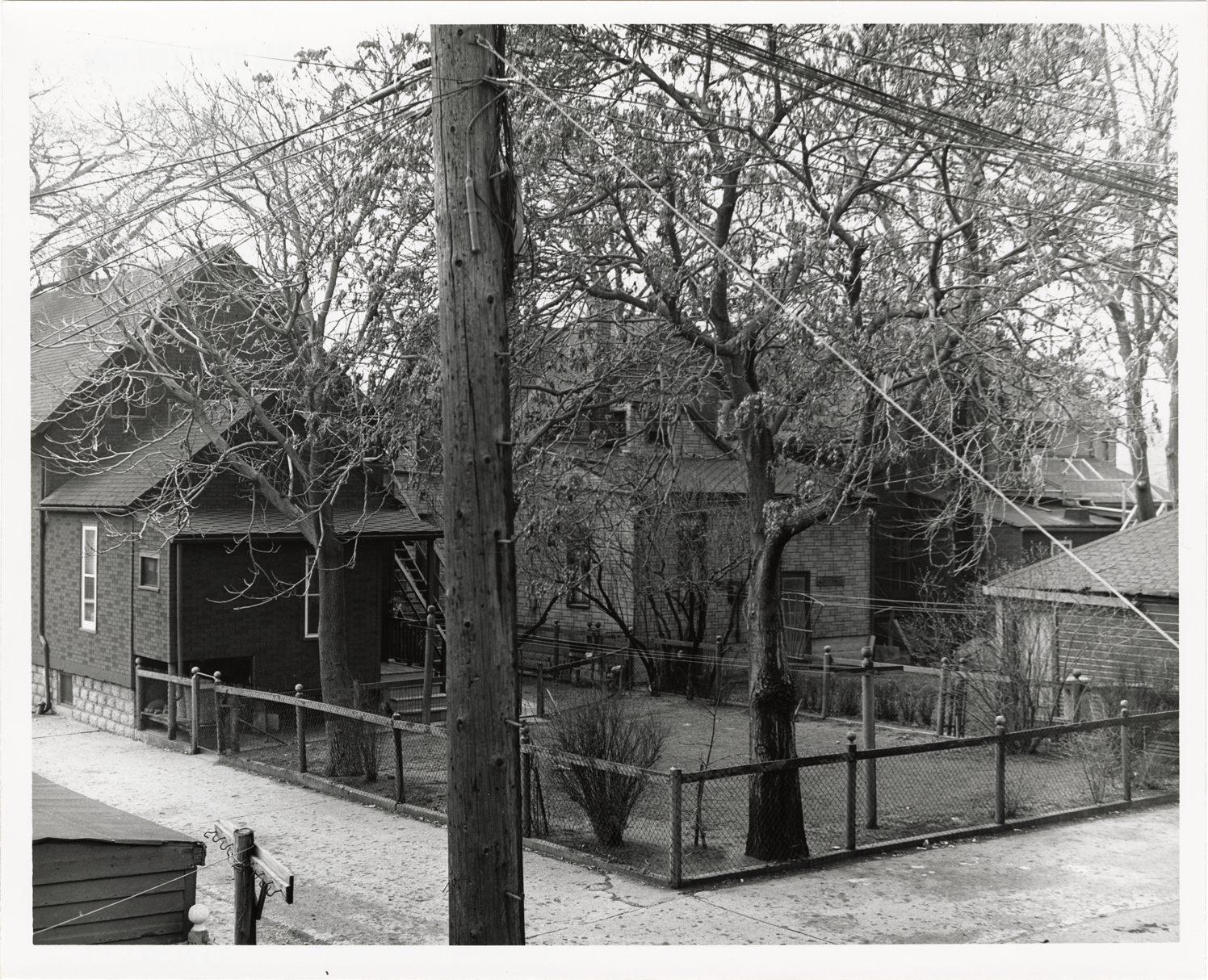 Rear view of a house with simulated brick siding located at 924 Calumet, showing backyard surrounded by a fence. Stamped on back: "Taken Mar 28, 1966." Handwritten on back: "Calumet Rehab. Proj. Rear 924 Calumet looking S.W. All to be removed."