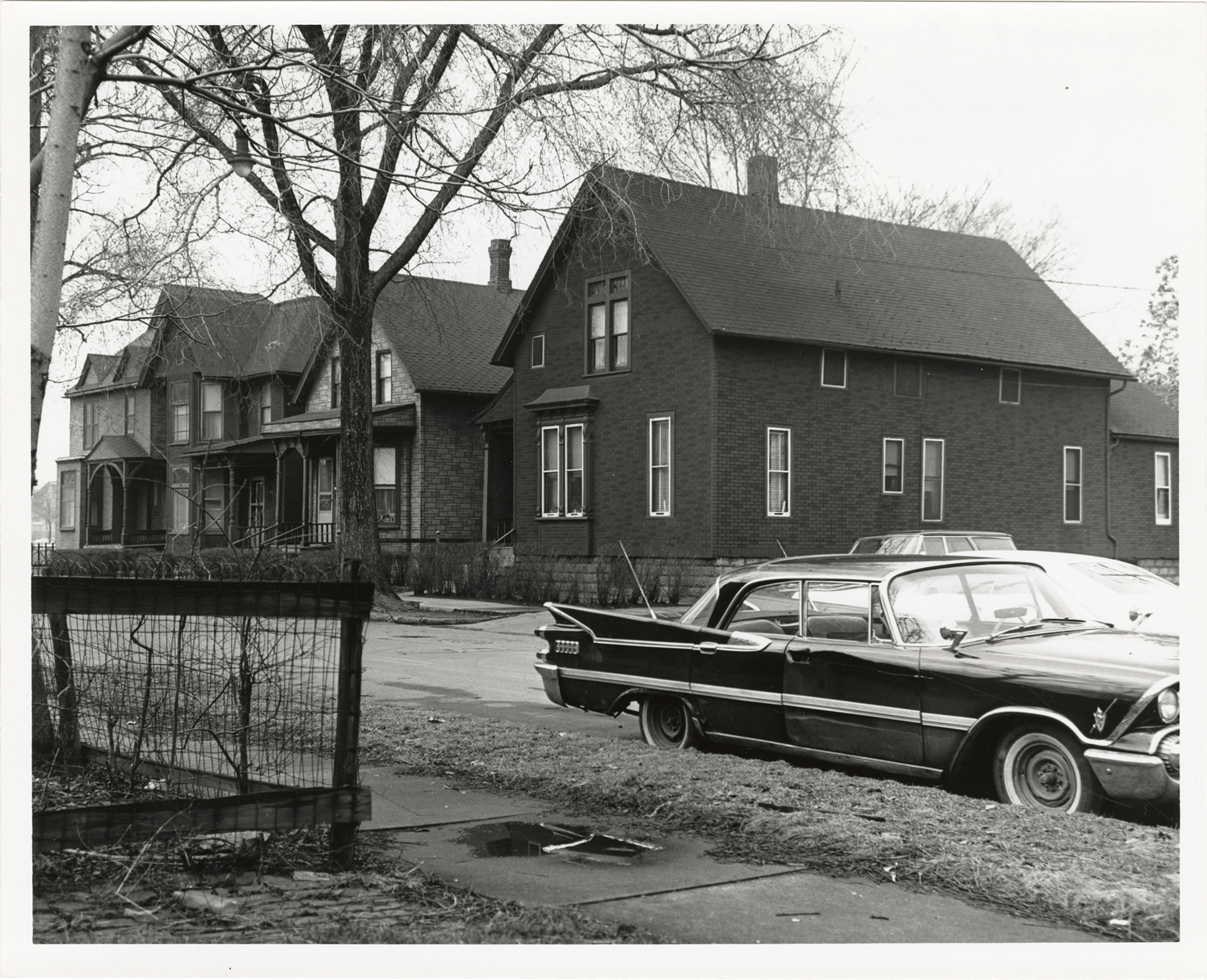 View of four two-story houses with simulated brick siding at 924-940 Calumet. Car in foreground. Stamped on back: "Taken Mar 28, 1966." Handwritten on back: "Calumet Rehab. Proj. North side Calumet 924-940. To be removed."