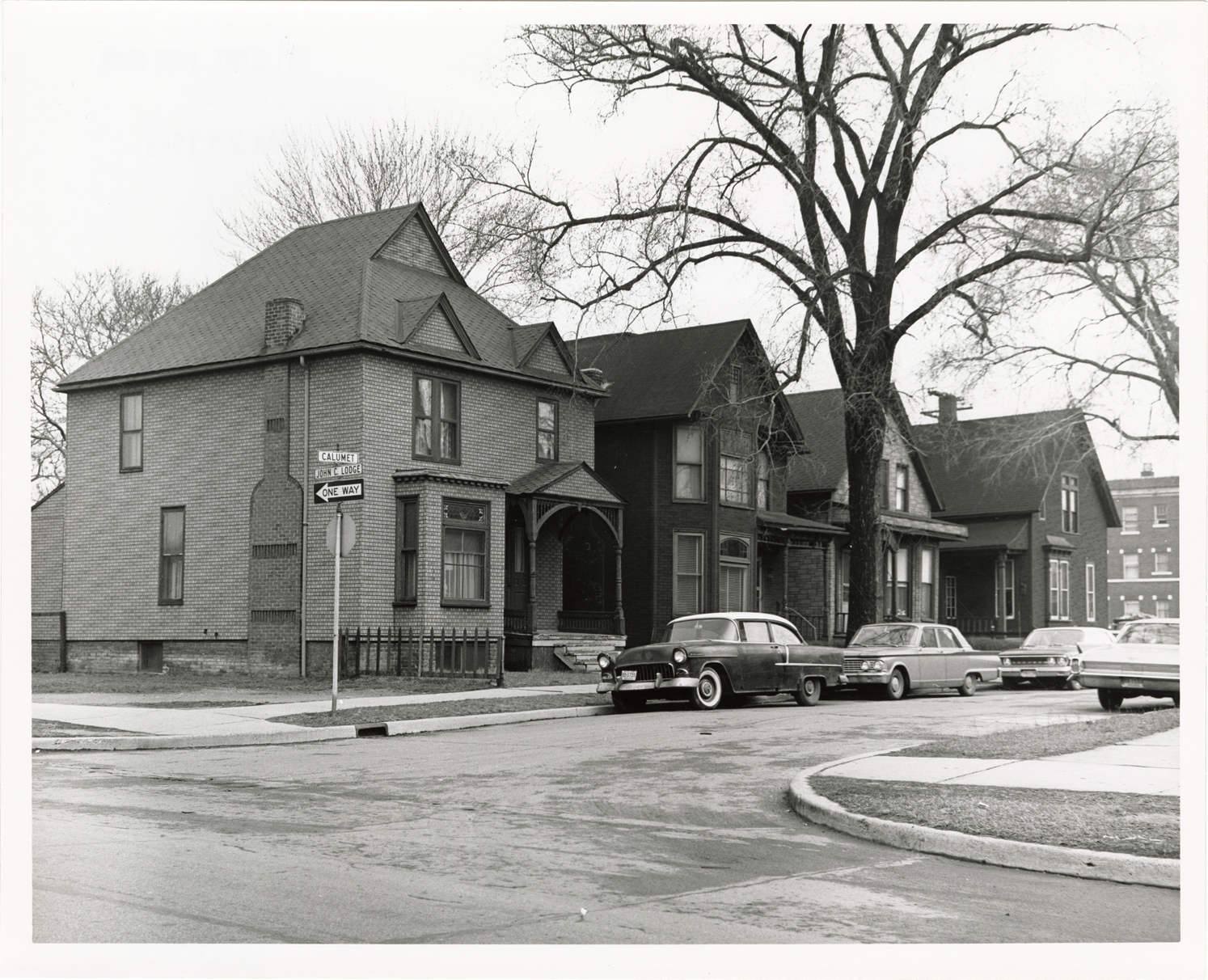 View of four two-story houses with simulated brick siding at 924-940 Calumet, near the corner of the John C. Lodge. Cars are parked in street. Stamped on back: "Taken Mar 28, 1966." Handwritten on back: "Calumet Rehab. Proj. 940-924 Calumet N.S. All to be removed."