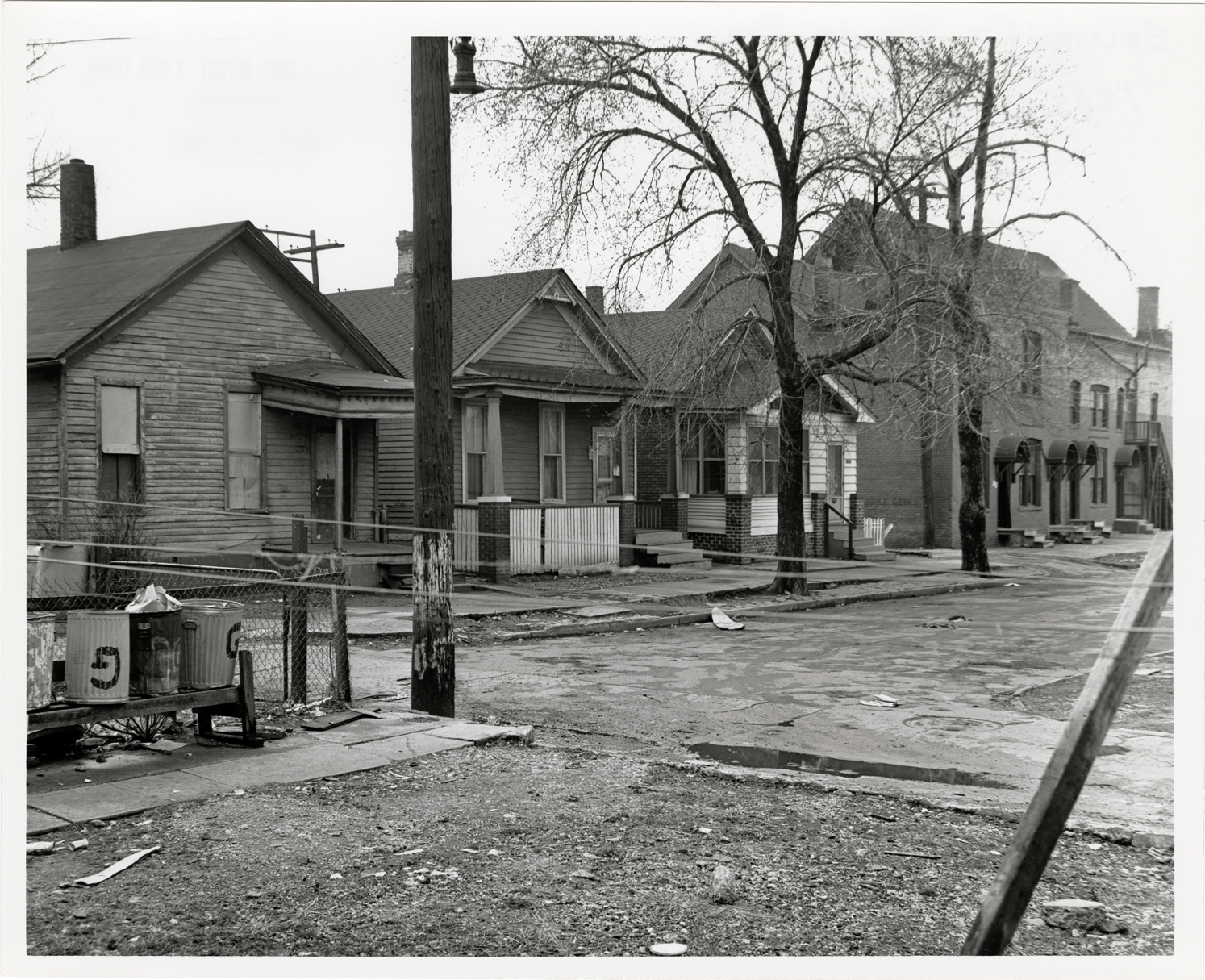 View of three one-story, wooden-frame houses located at 1825, 1831 and 1837 Selden St. Stamped on back: "Taken Mar 28, 1966." Handwritten on back: "Selden Ct. Rehab. Proj. 1825, 31 & 37 Selden to be removed."