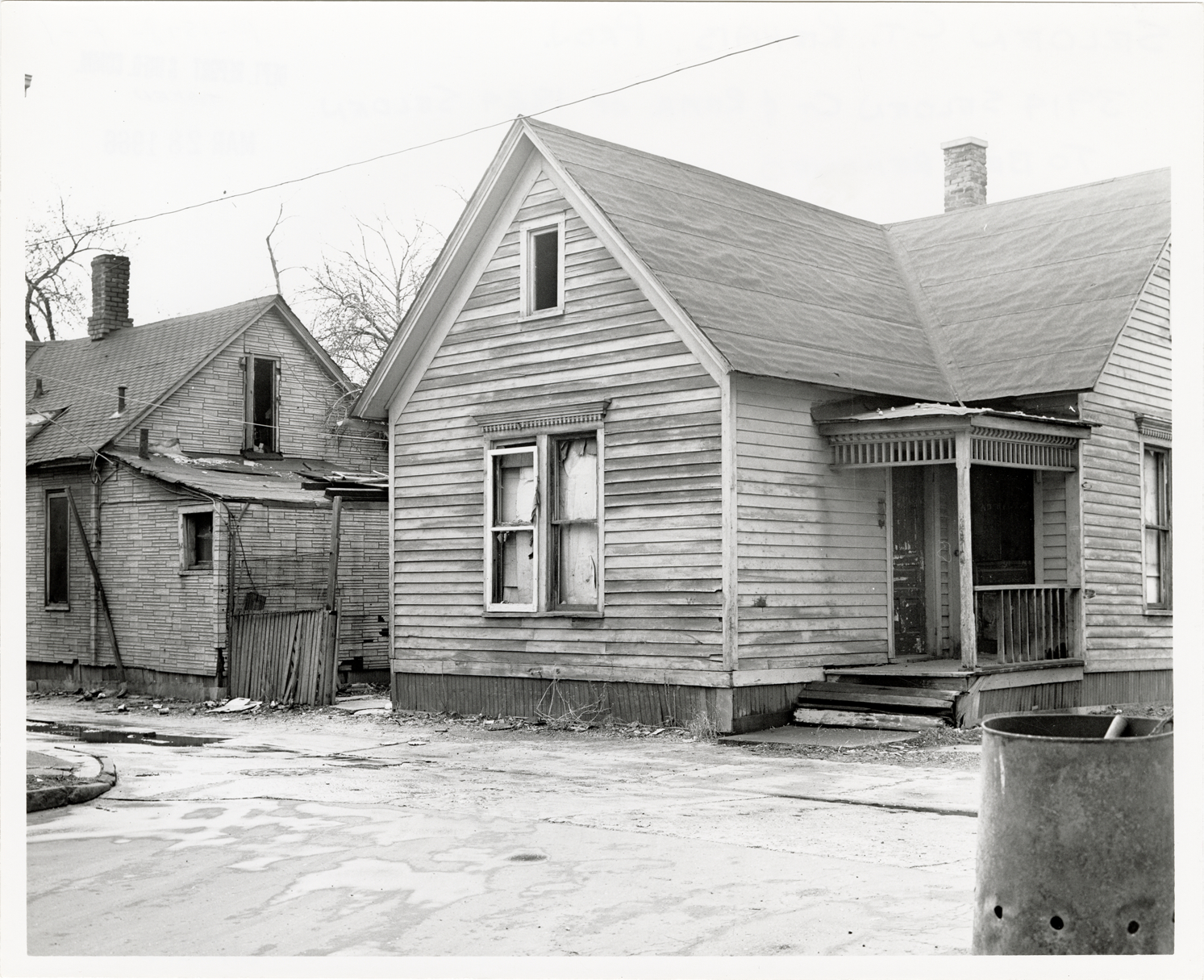 View of a one-story, wooden-frame house located at 3914 Selden Ct. and rear view of a house with simulated brick siding located at 1824 Selden St. Stamped on back: "Taken Mar 28, 1966." Handwritten on back: "Selden Ct. Rehab. Proj. 3914 Selden Ct. & rear of 1824 Selden to be removed."