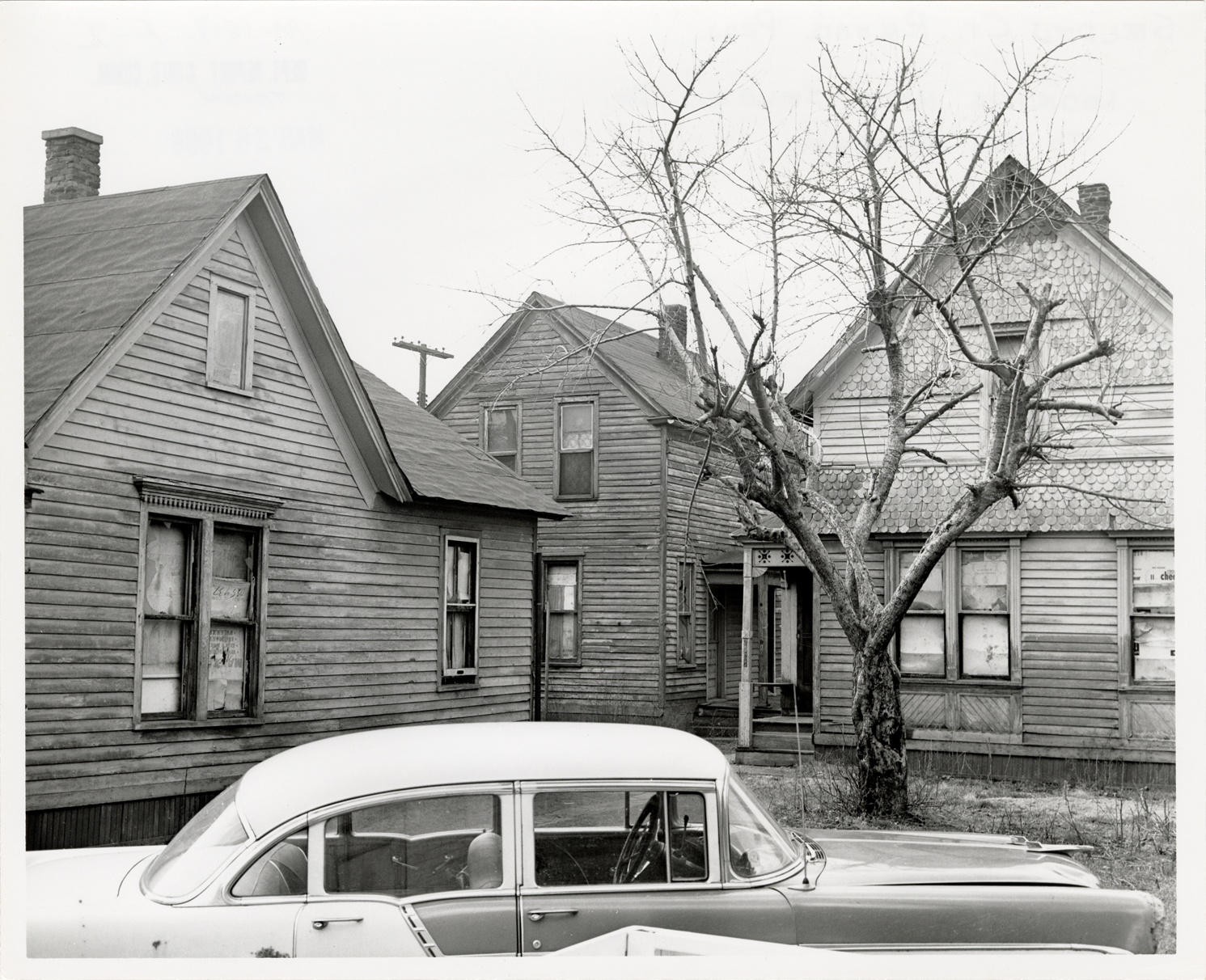 Close-up view of three wooden-frame houses located on Selden Ct. Automobile in foreground. Stamped on back: "Taken Mar 28, 1966." Handwritten on back: "Selden Ct. Rehab. Proj. Looking into Selden Ct. to be removed."