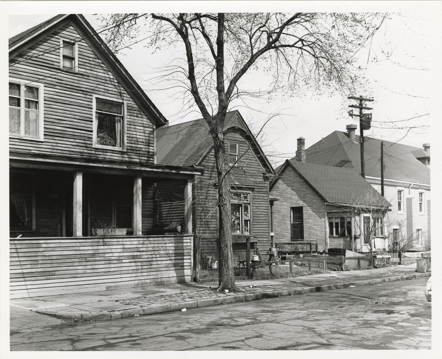 View of two wooden-frame houses and a house with simulated brick siding located at 1824-1836 Selden St. Stamped on back: "Taken Mar 28, 1966." Handwritten on back: "Selden Ct. Rehab. Proj. 1836-1824 Selden. To be removed."
