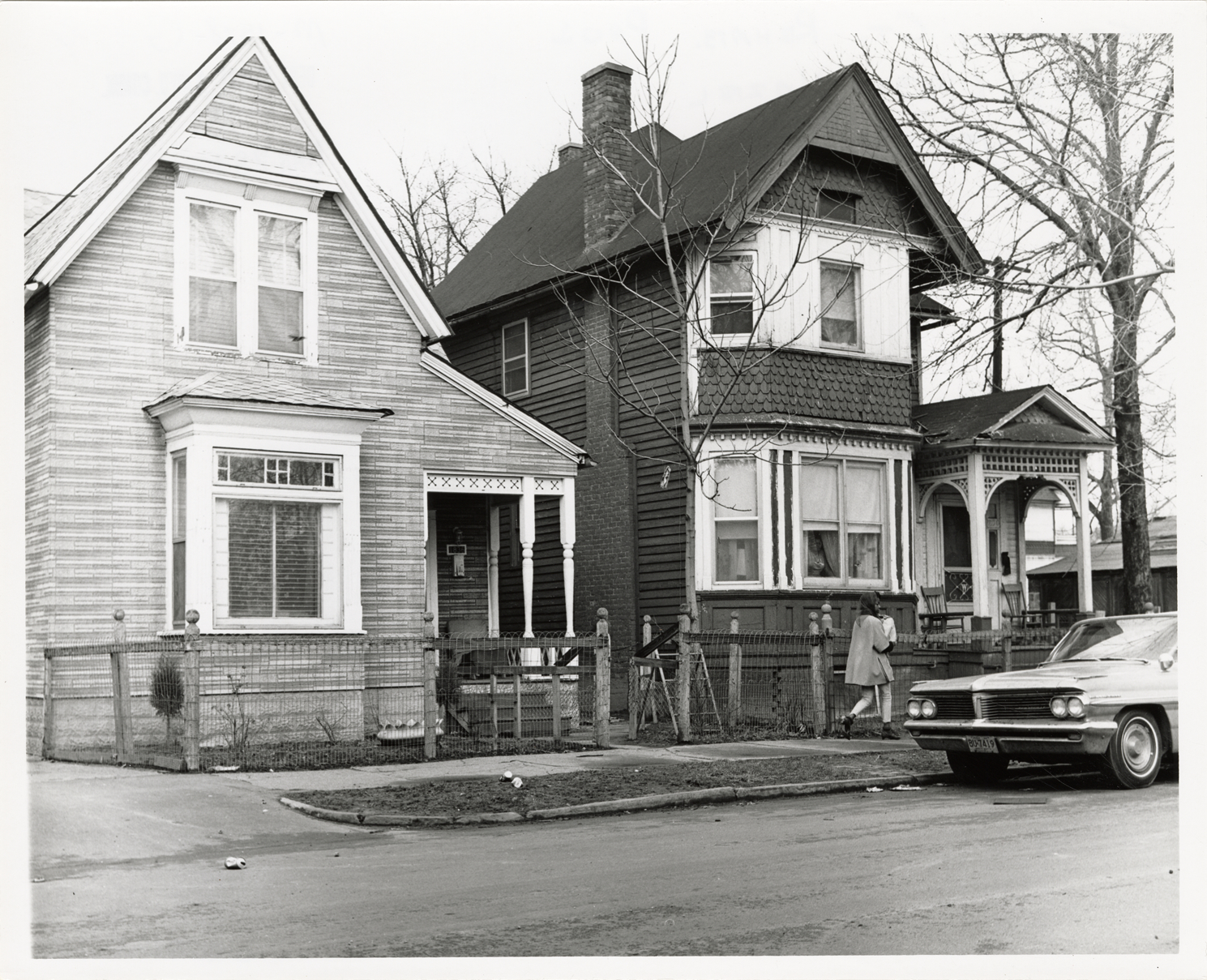 View of wooden-frame houses located at 1830 and 1836 Hazel. Woman walks on sidewalk. Stamped on back: "Taken Mar 28, 1966." Handwritten on back: "Selden Ct. Rehab. Proj. 1836 & 1830 Hazel. To be removed."