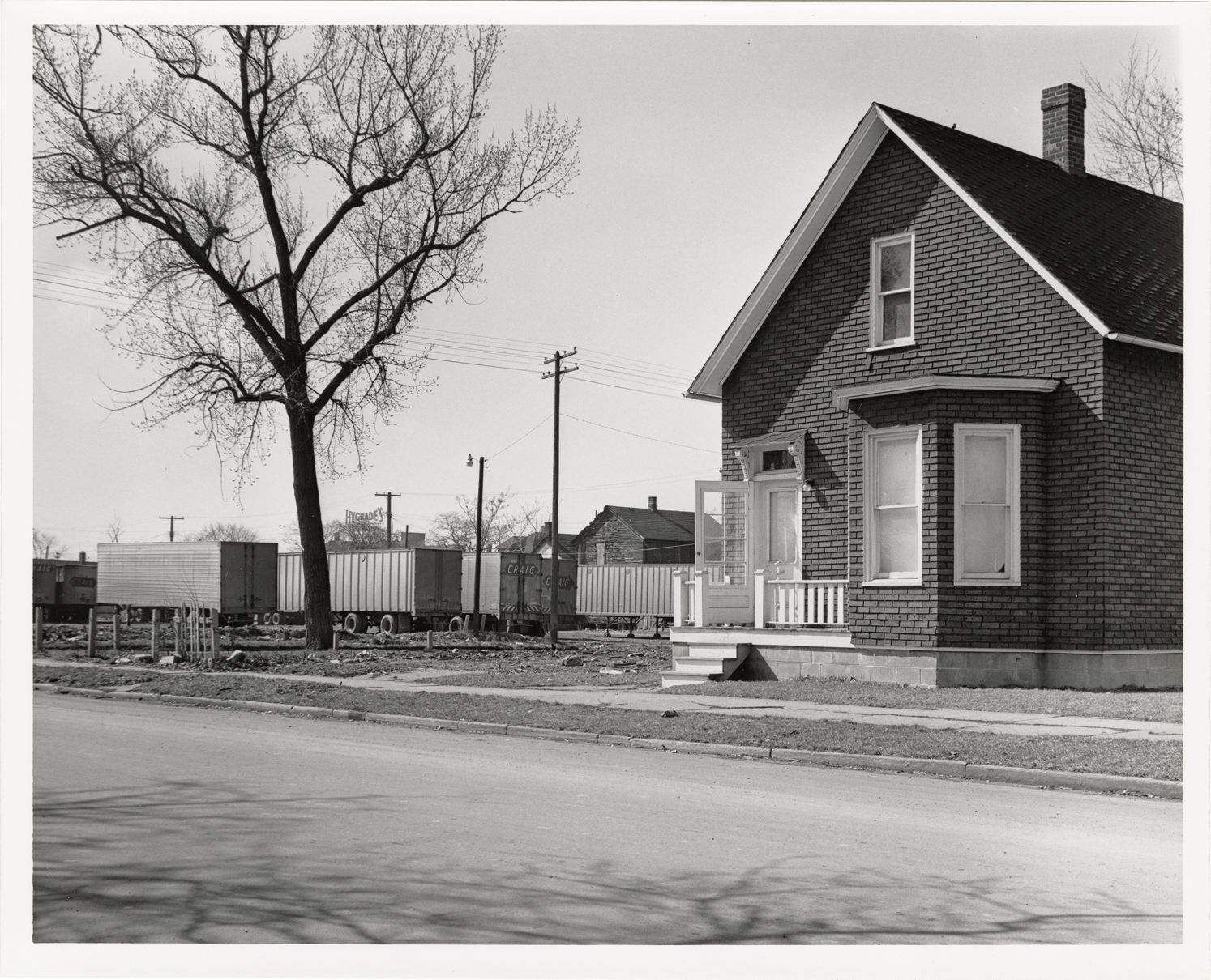 View of a house with simulated brick siding located at the corner of Butternut and Humboldt. Truck trailers are parked in adjacent lot. Stamped on back: "Taken Mar 28, 1966." Handwritten on back: "Ash-Humboldt Rehab. Project. Southwest corner of Butternut & Humboldt. Truck parking to be acquired."