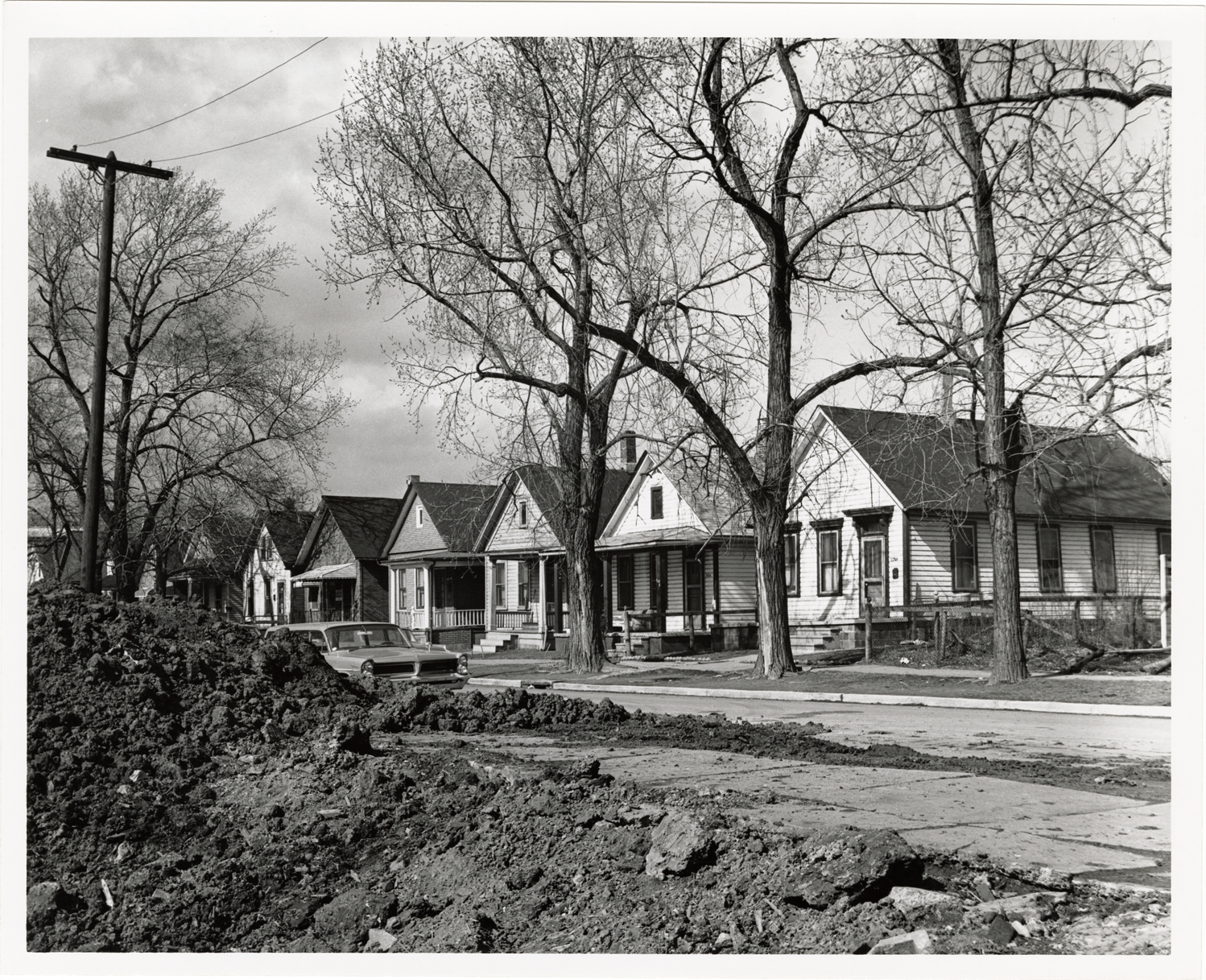 View of several one-story, wooden-frame houses located on Humboldt. Stamped on back: "Taken Mar 28, 1966." Handwritten on back: "Ash-Humboldt Rehab. East side of Humboldt. All structures except 2nd from right to be acquired."