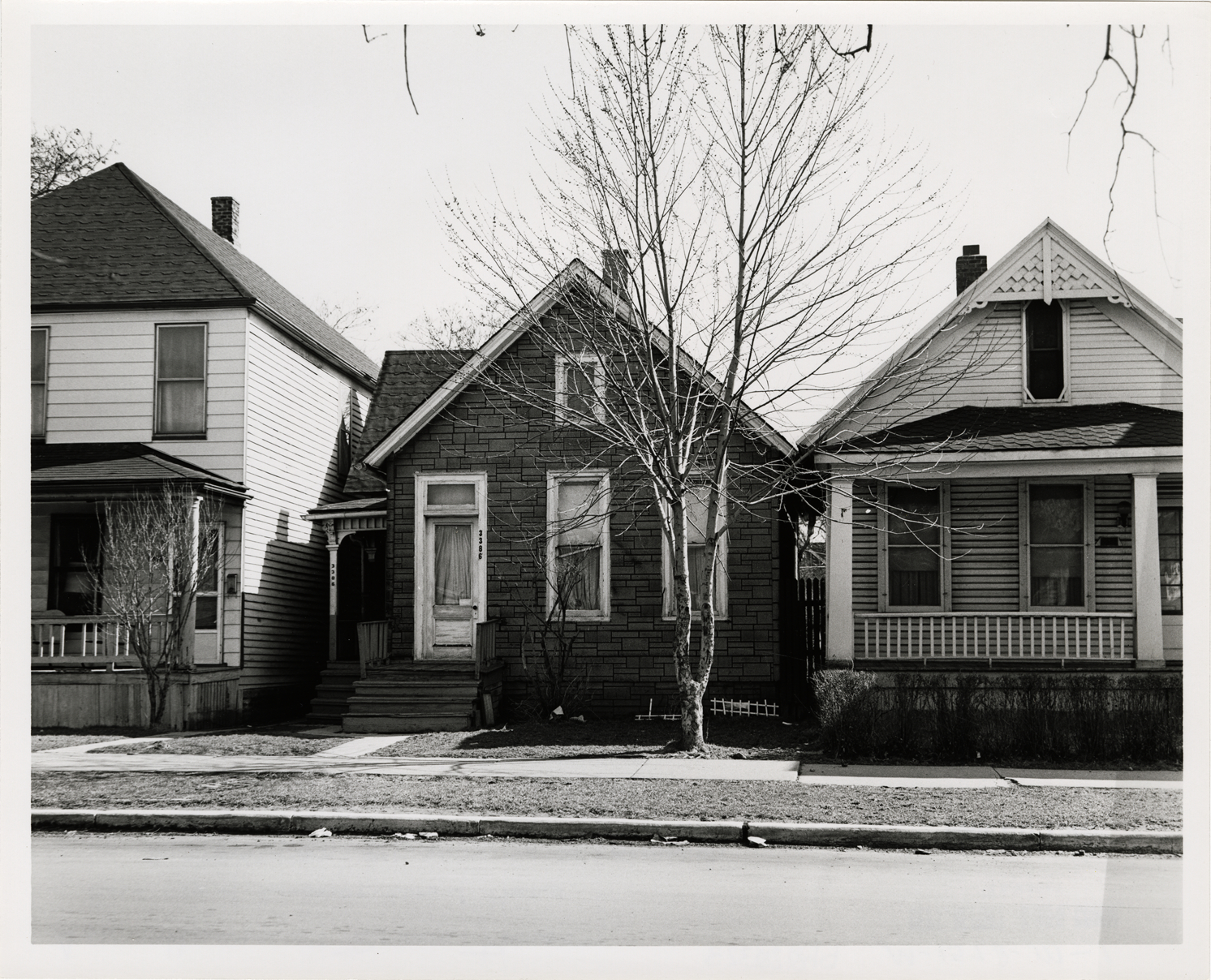 View of a house with simulated stone siding located at 3386 Humboldt, between two wooden-frame houses. Stamped on back: "Taken Mar 28, 1966." Handwritten on back: "Ash-Humboldt Rehab. Project. East side of Humboldt, south of Myrtle. 2 structures on left to be acquired."
