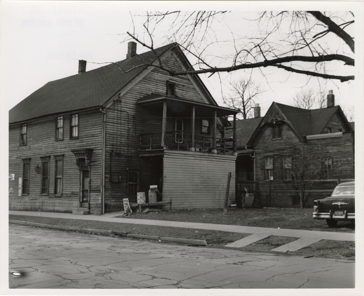 Side and rear view of a two-story wooden-frame house located at the corner of Butternut and Lawton. Stamped on back: "Taken Mar 28, 1966." Handwritten on back: "NE corner on Butternut at Lawton. To be acquired."