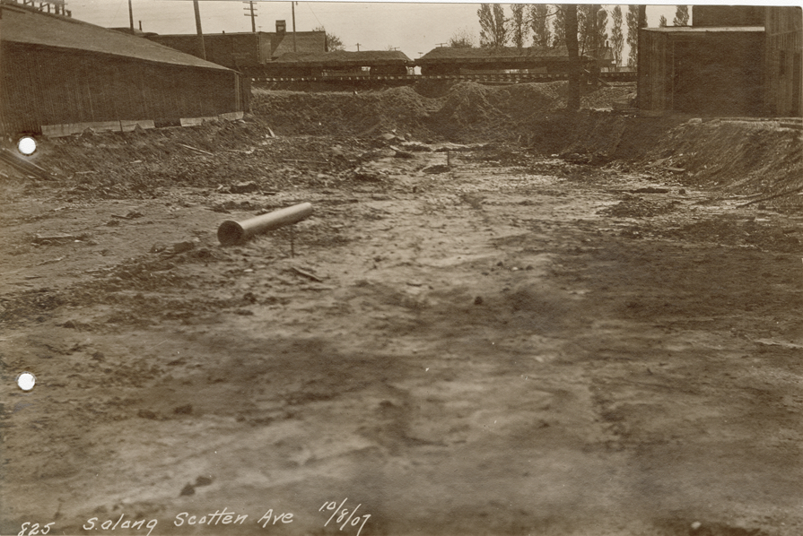 View of construction site along Scotten Ave., during construction of the Michigan Central Railroad. Printed on front: "S. along Scotten Ave., 10/8/07."