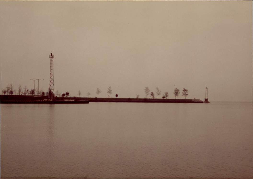 View of two lighthouses on land spit. Label on back: "Michigan Thumb area--Water--Tower on land spit." Stamped on back: "Steven's Studio, 132 State Street, Harbor Beach, MI 48441." Handwritten on back: "Steven W. Donahue."
