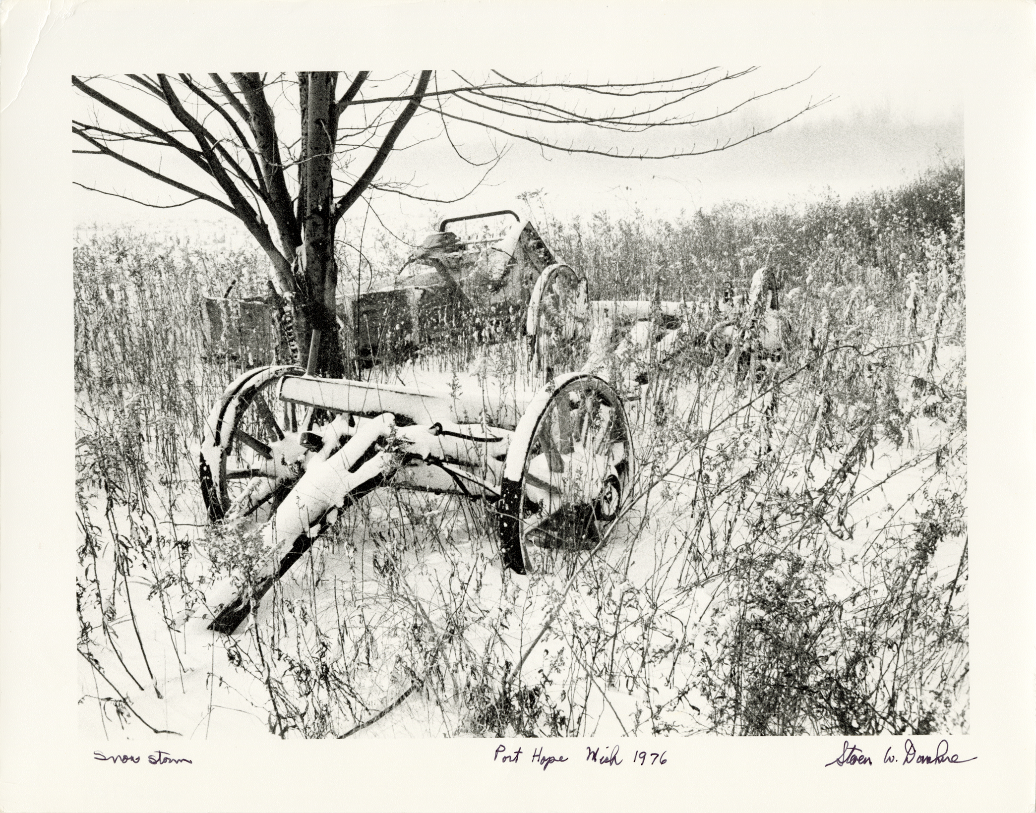 View of snow-covered hay wagon in field during winter. Label on back: "Michigan Thumb area--Winter--Hay wagon in snow, 1976, also called 'Snow storm.'"