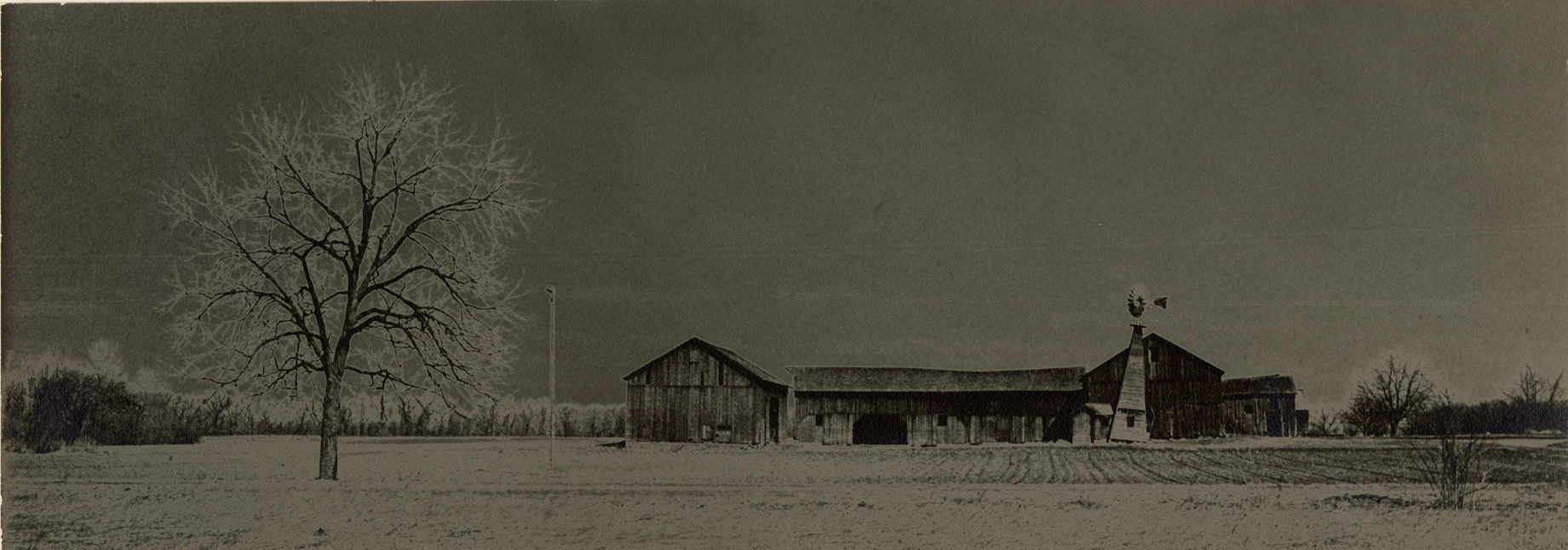 Solarized photograph of farm buildings and windmill. Handwritten on mat front: "Steven W. Donahue." Label on back: "Michigan Thumb area--Farms--Solarized farm buildings."