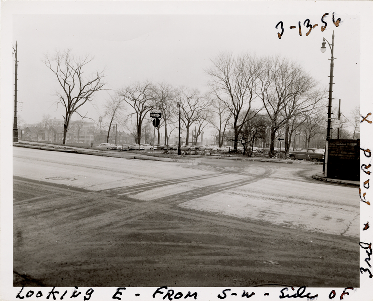 View of the intersection of Third Ave. and W. Palmer St. Cars are parked in background. Handwritten on on front: "Looking E. from S.W. side of 3rd & Ford X. 3-13-56."