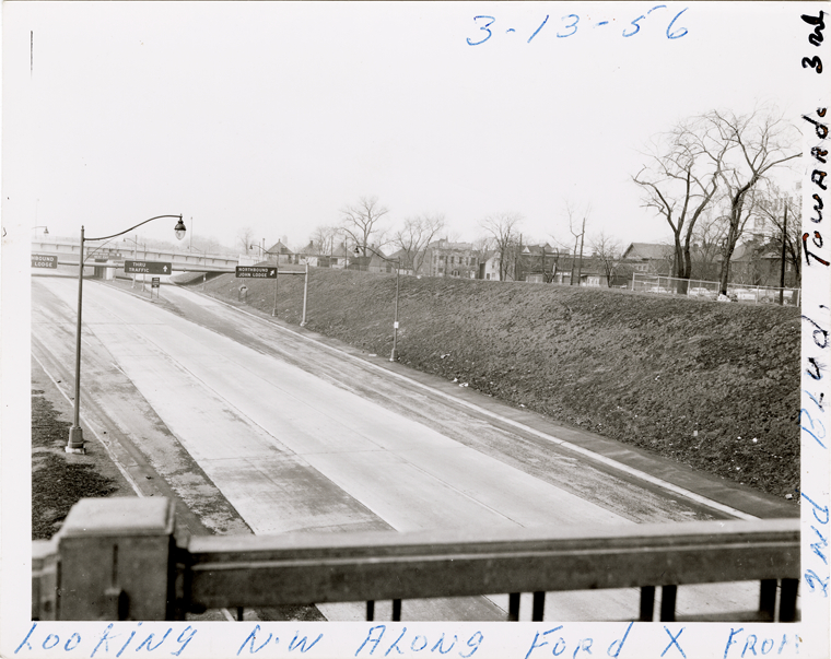 View of the I-94 Ford Expressway and embankment. Houses in background. Handwritten on on front: "Looking N.W. along Ford X from 2nd Blvd. [sic] towards 3rd. 3-13-56."