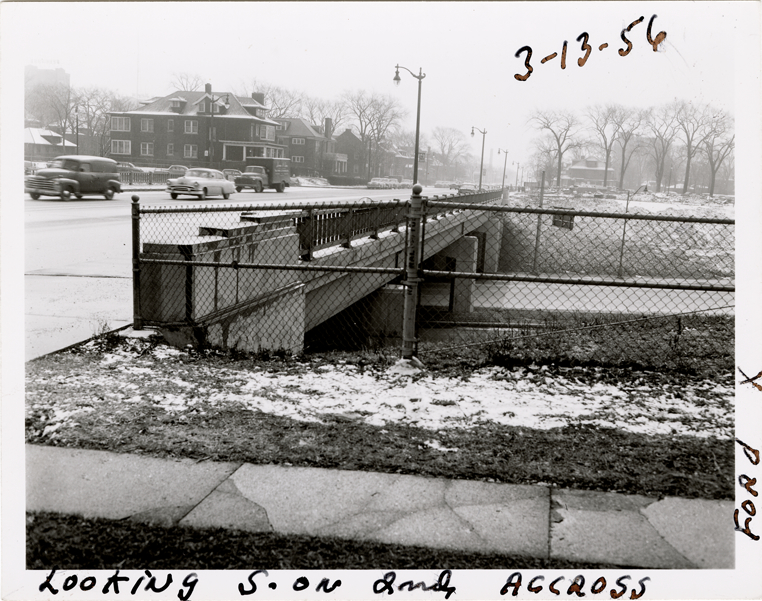 View of cars on Second Ave. over the I-94 Ford Expressway. Sidewalk in foreground; houses in background. Handwritten on on front: "Looking S. on 2nd accross [sic] Ford X. 3-13-56."