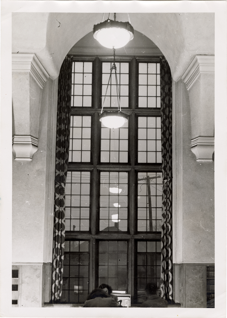 View of window at the Mark Twain Branch Library, Detroit Public Library. Light fixtures suspended from ceiling. Handwritten on back: "Mark Twain Branch, building interior view, front floor to ceiling windows, 1950."
