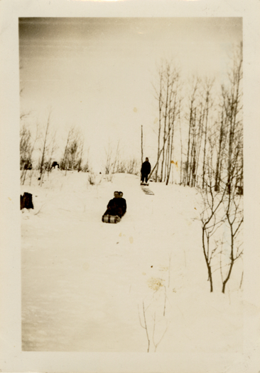 View of two men riding a toboggan, Camp Escanaba, Civilian Conservation Corps, Company 1620 in Escanaba, Michigan. Another man with toboggan in background. Stamped on back: "Ace Photo Service. Sparkling snapshots. Minneapolis, Minnesota."