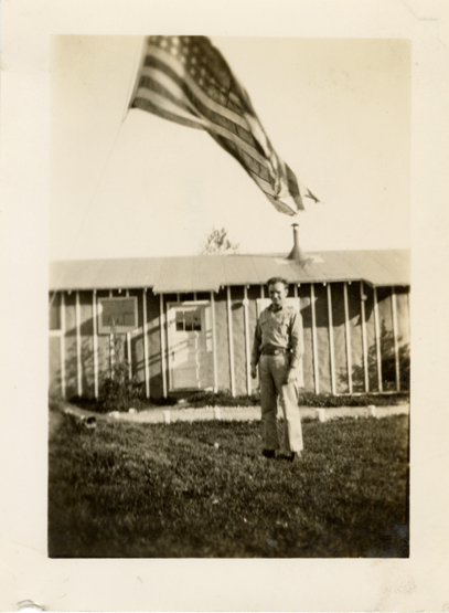 View of a man, in uniform, posing in front of barracks at Camp Escanaba, Civilian Conservation Corps, Company 1620 in Escanaba, Michigan. American flag in background.