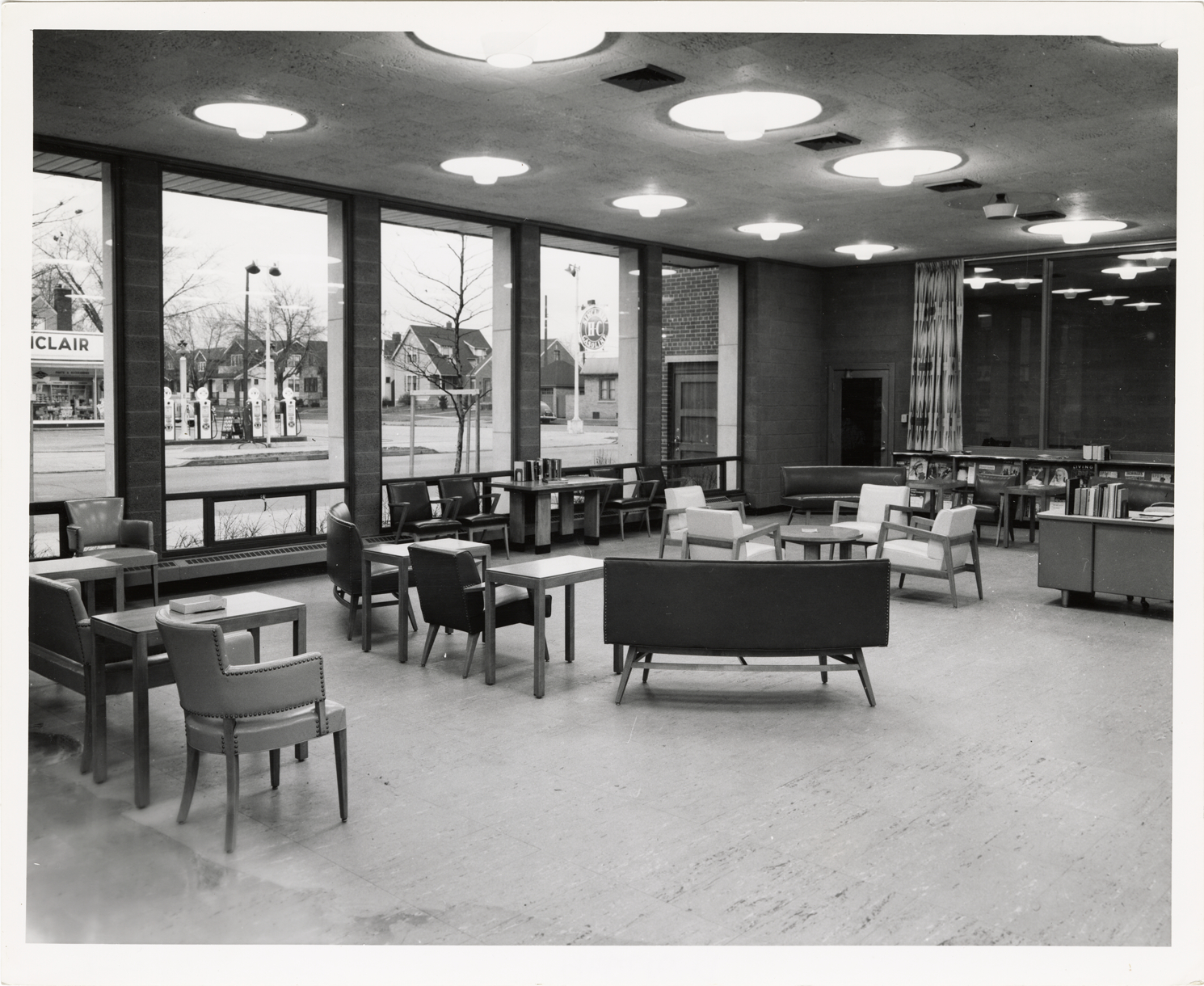 Interior view of the Lincoln Branch Library, Detroit Public Library. Room is furnished with tables, chairs, sofas and bookshelves. Service station is visible from windows. Typed on back: "Detroit Public Library, Lincoln Branch. Dedicated October 29, 1951." Handwritten on back: "Lincoln."