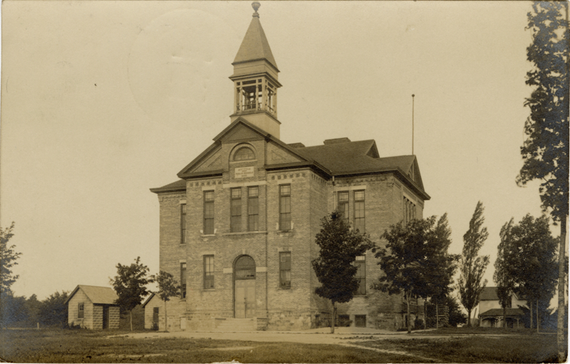 View of two-story brick schoolhouse with cupola in Mayville, Michigan. Handwritten on back: "Am still alive and meant to have sent you a postcard before this but did not go to town until Sat. afternoon. Expect to go to North Lake tomorrow if we can find someone to go with us, who can row a boat." Card is postmarked July 26, 1909.