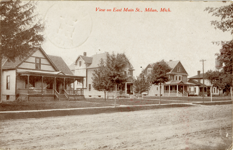 View of wooden-frame houses on E. Main St. in Milan, Michigan. Printed on front: "View on East Main St., Milan, Mich." Handwritten on back: "Dear Erna, Here I am, in this big town of Milan. I have been here since last Wednesday, expect to be home Friday. I was in Ann Arbor week before that and spent a delightful week there. Loads of love to you from Fritzie." Card is postmarked July 27, 1911.