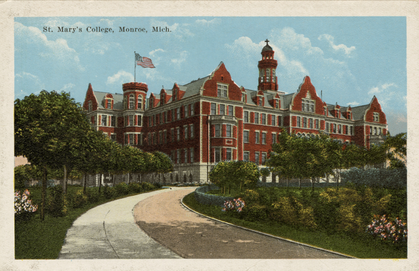 View of St. Mary's College in Monroe, Michigan. Printed on front: "St. Mary's College, Monroe, Mich." Printed on back: "Pub. for F.L.A. Mitchell, Monroe, Mich."