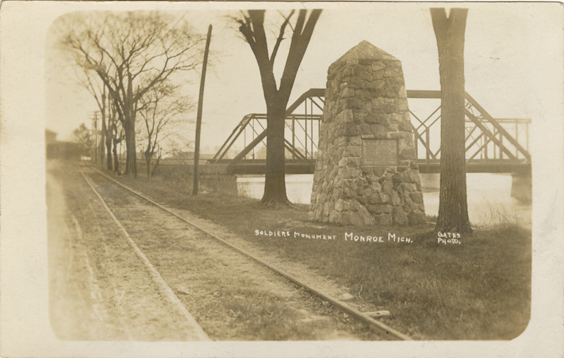 View of a monument to soldiers killed during the Battle of River Raisin in Monroe, Michigan. Railroad tracks on left; bridge in background. Printed on front: "Soldiers monument, Monroe, Mich. Gates, photo."