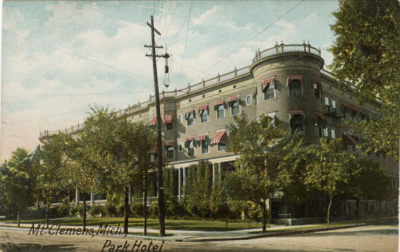 View of the Park Hotel in Mt. Clemens, Michigan. Printed on front: "Park Hotel, Mt. Clemens, Mich." Printed on back: "The Hugh C. Leighton Co., manufacturers, Portland, Me., U.S.A. Printed in Frankfort o/Main, Germany, 5596."