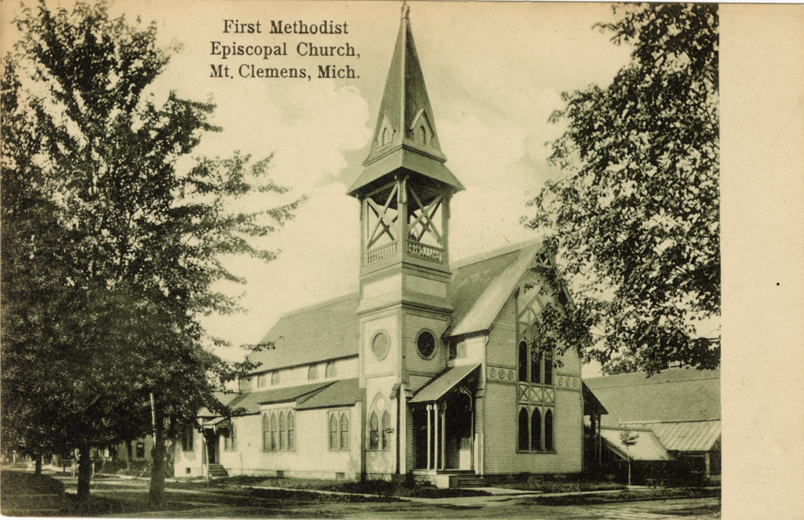 View of the First Methodist Episcopal Church in Mt. Clemens, Michigan. Printed on front: "First Methodist Episcopal Church, Mt. Clemens, Mich." Printed on back: "Germany."