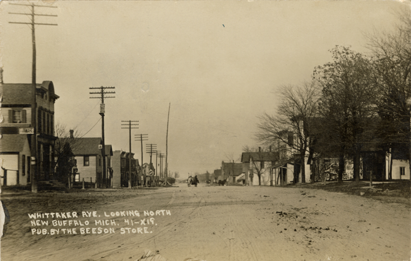 View of commercial buildings on Whittaker Ave. in New Buffalo, Michigan. Printed on front: "Whittaker Ave. looking north, New Buffalo, Mich. 41-X19. Pub. by the Beeson Store." Printed on back: "Schmidt, the druggist. New Buffalo, Mich." Foreign language message handwritten on back. Card is postmarked September 7, 1909.