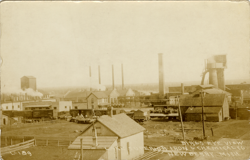 View of the Lake Superior Iron and Chemical Company in Newberry, Michigan. Printed on front: "Birds eye view, Lake Superior Iron & Chemical Co., Newberry, Mich."