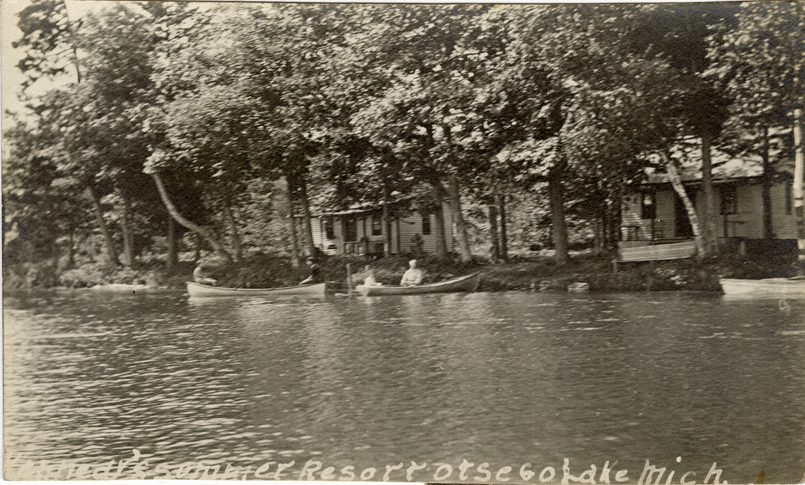 View of guests in a rowboat and canoe on the water at Kennedy's Summer Resort in Otsego Lake, Michigan. Wooden-frame cottages in background. Printed on front: "Kennedy's Summer Resort, Otsego Lake, Mich."