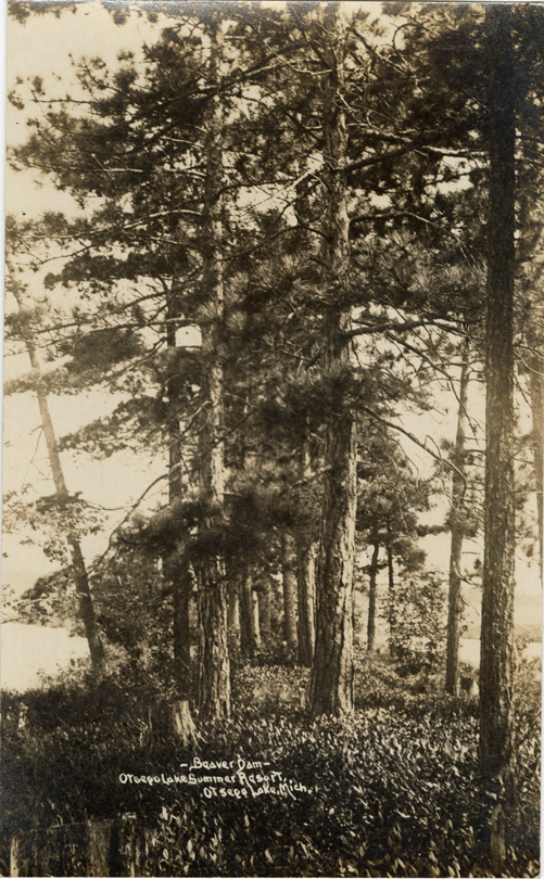 View of a beaver dam at Otsego Lake Summer Resort at Otsego Lake, Michigan. Printed on front: "Beaver dam, Otsego Lake Summer Resort, Otsego Lake, Mich."