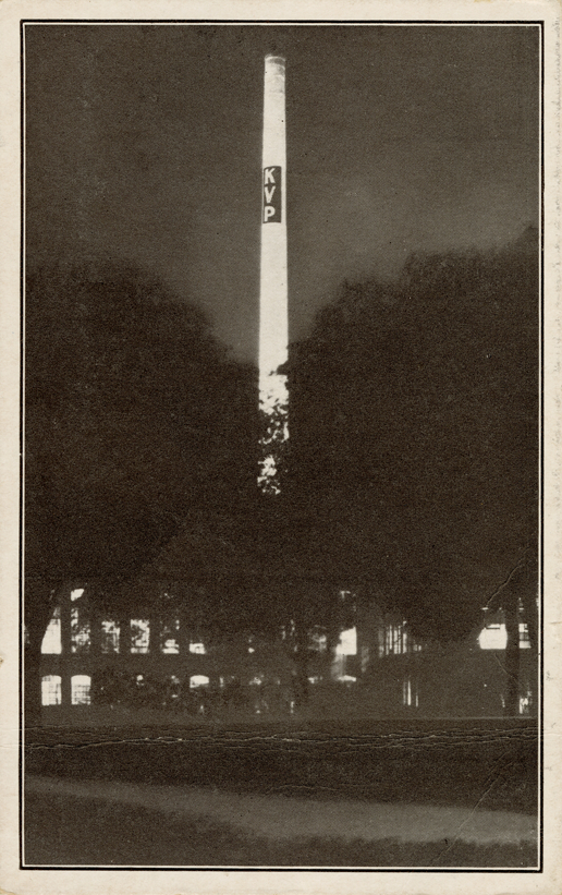 Nighttime view of the smokestack at the Kalamazoo Vegetable Parchment Company in Parchment, Michigan. Printed on back: "A night scene of Mill no. 1 of the Kalamazoo Vegetable Parchment Company, Parchment, Mich. The smoke stack with its 285 feet of solid concrete coated with aluminum paint reflecting the brilliant rays of powerful searchlights pierces the blackness of the night like a huge electric finger. It can be seen for miles."