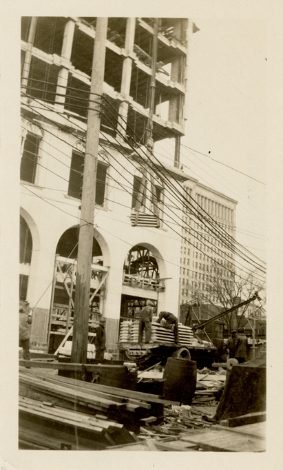 View of Fisher Building during construction. Building was designed by Albert Kahn. Workers on truck in foreground.