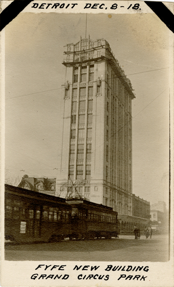 View of Fyfe Building, with streetcar in foreground. Printed on front: "Detroit, Dec. 8-18. Fyfe, new building, Grand Circus Park."