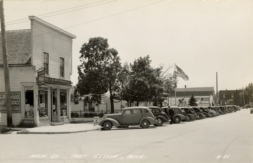View of commercial buildings and cars on Main St. in Port Austin, Michigan. J.S. Pittwood store in foreground. Printed on front: "Main St., Port Austin, Mich." Printed on back: "All rights reserved. The L.L. Cook Co., Milwaukee."