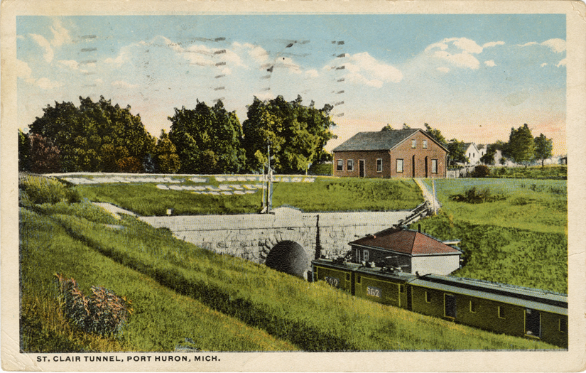 View of the St. Clair Tunnel in Port Huron, Michigan. Printed on front: "St. Clair Tunnel, Port Huron, Mich." Printed on back: "Published by Harry H. Hamm, Erie, Pa. Made in U.S.A. H.H. Hamm, Erie, Pa. Made in U.S.A." Handwritten on back: "Look Fannie, this is where we play hide and seek. Max." Card is postmarked July 5, 1920.
