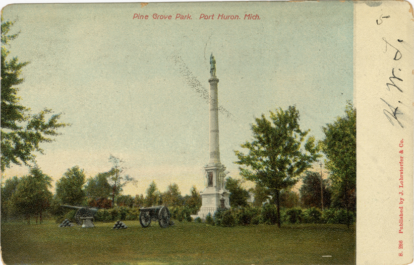 View of the Soldiers' and Sailors' Monument in Pine Grove Park at Port Huron, Michigan. Cannons in foreground. Printed on front: "Pine Grove Park, Port Huron, Mich. S. 286. Published by J. Lohrstorfer & Co." Printed on back: "S. Langsdorf & Co., New York, Germany." Card is postmarked February 13, 1907.