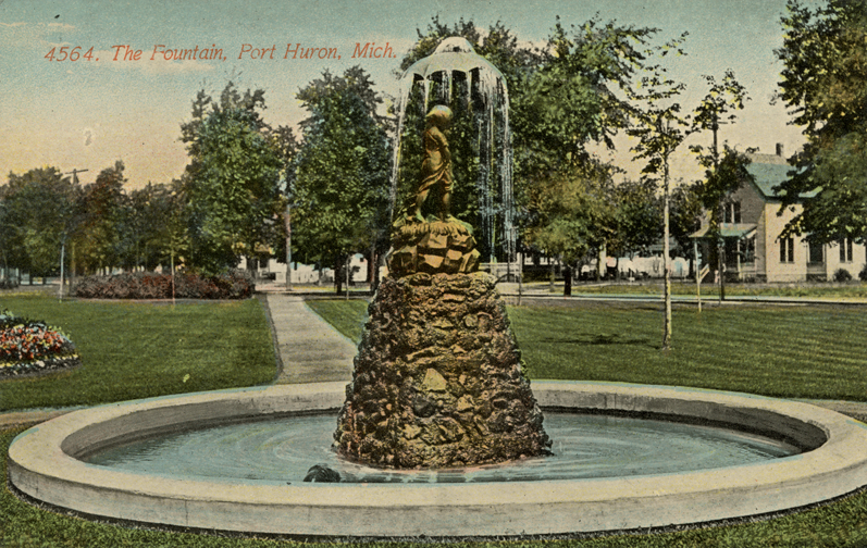 View of a fountain in Port Huron, Michigan. Printed on front: "4564. The fountain, Port Huron, Mich." Printed on back: "Pub. by the Acmegraph Co., Chicago, Ill."