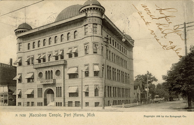 View of the Maccabees Temple in Port Huron, Michigan. Printed on front: "A 7438. Maccabee Temple, Port Huron, Mich. Copyright 1905 by the Rotograph Co." Handwritten on front: "Hope you will have a pleasent [sic] visit." Printed on back: "The Rotograph Co., N.Y., City, (Germany)."