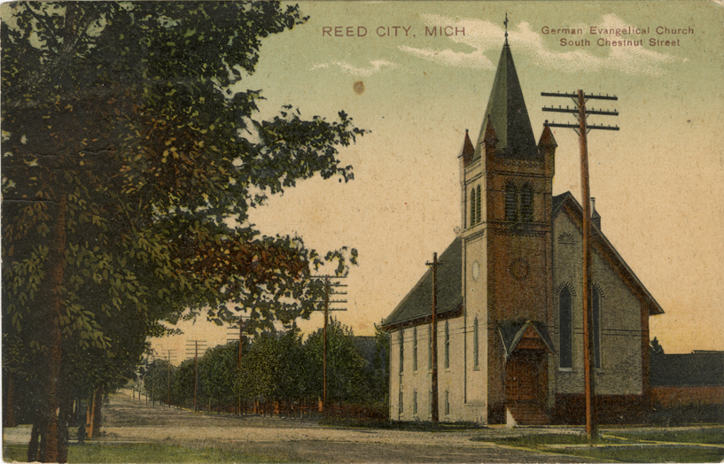 View of the German Evangelical Church in Reed City, Michigan. Printed on front: "Reed City, Mich. German Evangelical Church, South Chestnut Street." Printed on back: "10007. Pub. by L.H. Norman, Reed City, Mich. Printed in Germany." Handwritten on back: "Dear Mary, Well how are you? I'm feeling fine. I've gained five lbs. since my return home. My sister and I have lots of fun together. Have been quite busy going errands, helping with the housework and sewing or at least trying to. Will write you a letter soon and wish you would write to me. Loving, Lena H."