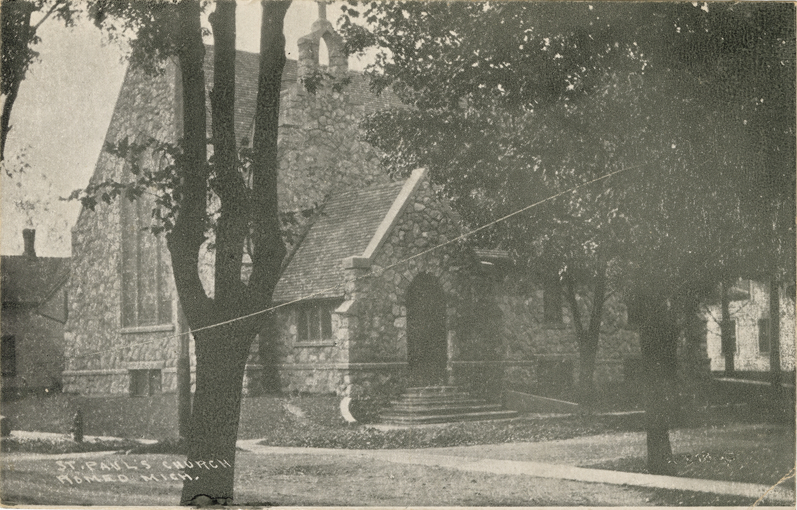 View of St. Paul's Episcopal Church in Romeo, Michigan. Printed on front: "St. Paul's Church, Romeo, Mich." Printed on back: "103. Pub. by W.H. Lighthall, Royal Oak, Mich."