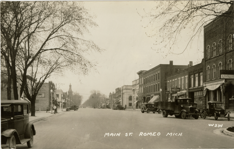 View of commercial buildings, cars and trucks on Main St. in Romeo, Michigan. Printed on front: "Main St., Romeo, Mich."