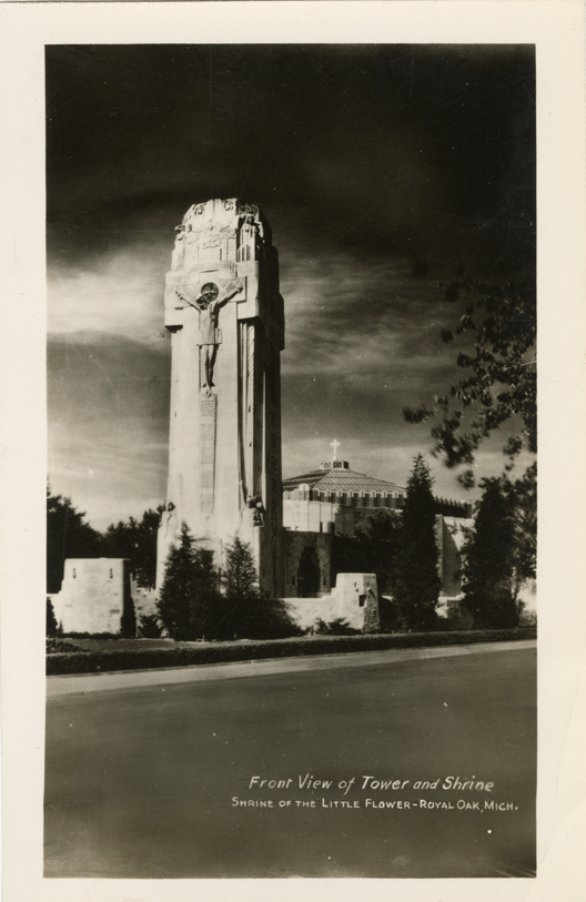 View of the Shrine of the Little Flower Catholic church in Royal Oak, Michigan. Printed on front: "Front view of tower and shrine, Shrine of the Little Flower, Royal Oak, Mich."