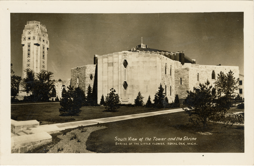 View of the Shrine of the Little Flower Catholic church in Royal Oak, Michigan. Printed on front: "South view of the tower and shrine, Shrine of the Little Flower, Royal Oak, Mich."